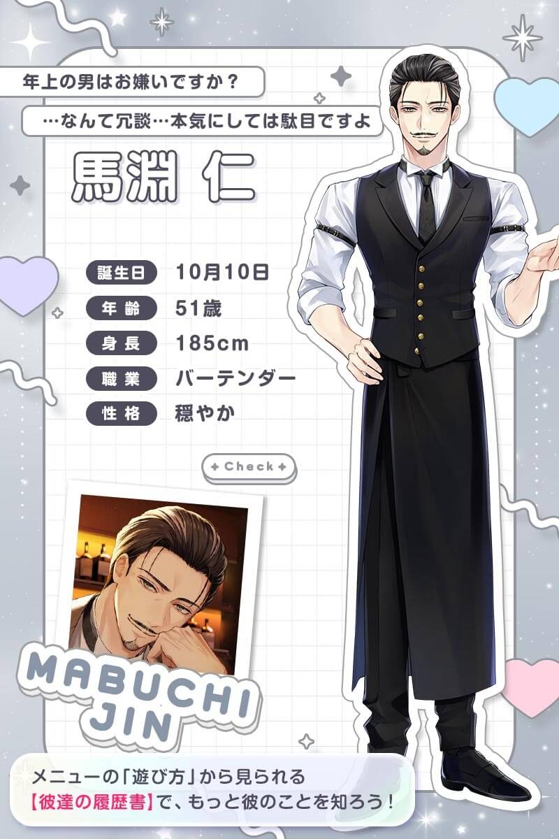 【プロフ】を押せば、彼の誕生日や年齢、身長などが確認できます。彼によっては年齢が「???」の人物もいます。思うに幼馴染とか学生とか年齢を決めてしまうとあなたと同い年なのか年下なのか自由に想像する余地がなくなってしまい、面白さが半減してしまうからではないでしょうか?